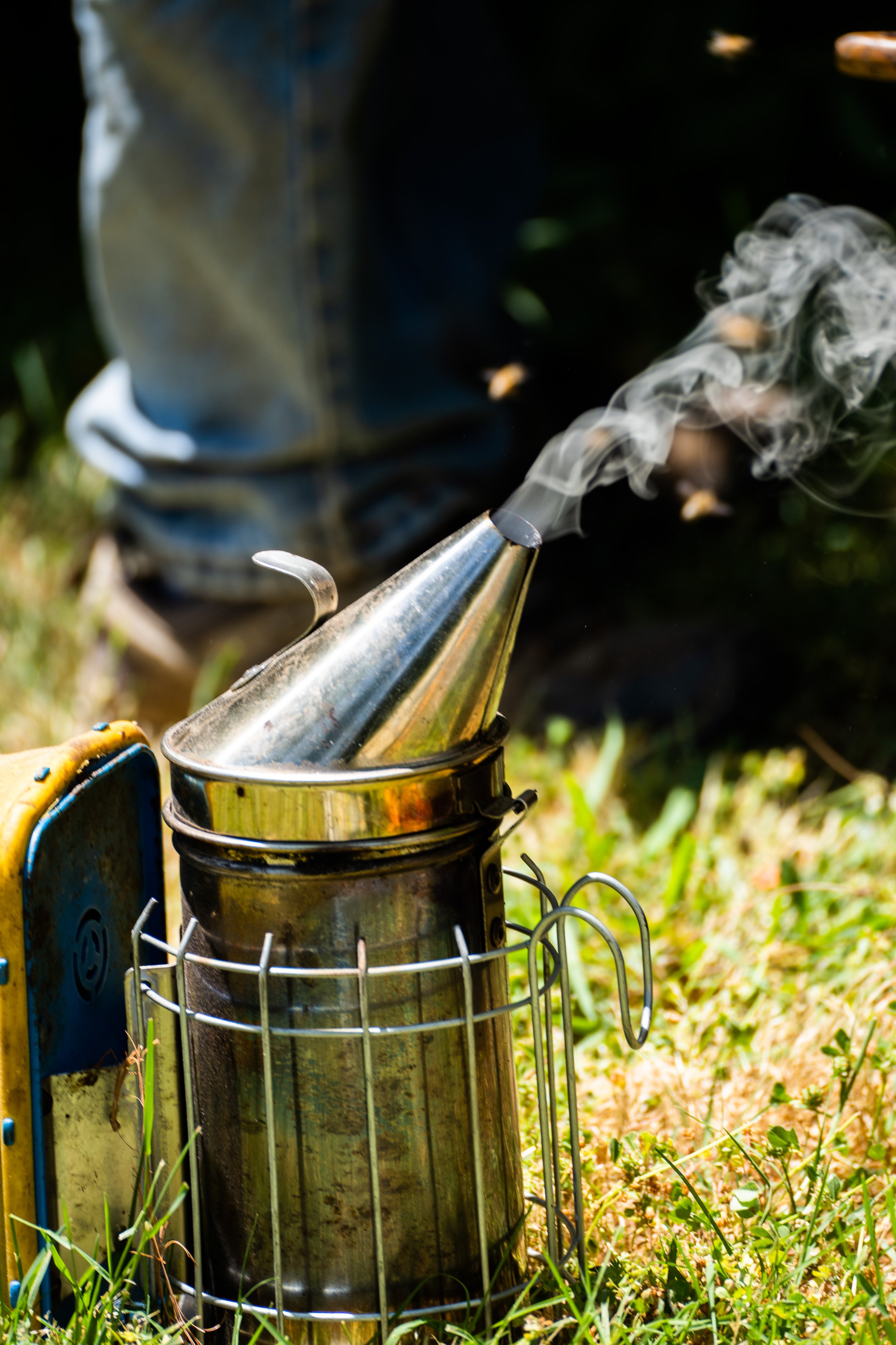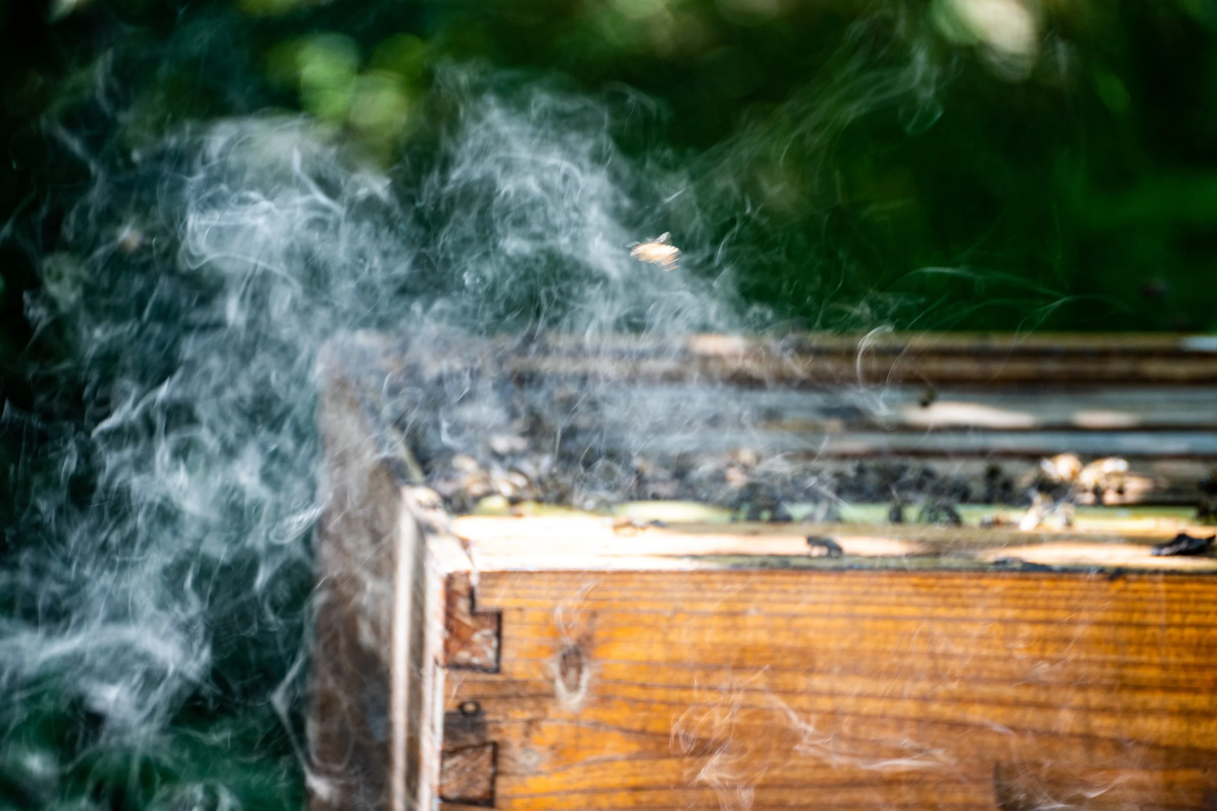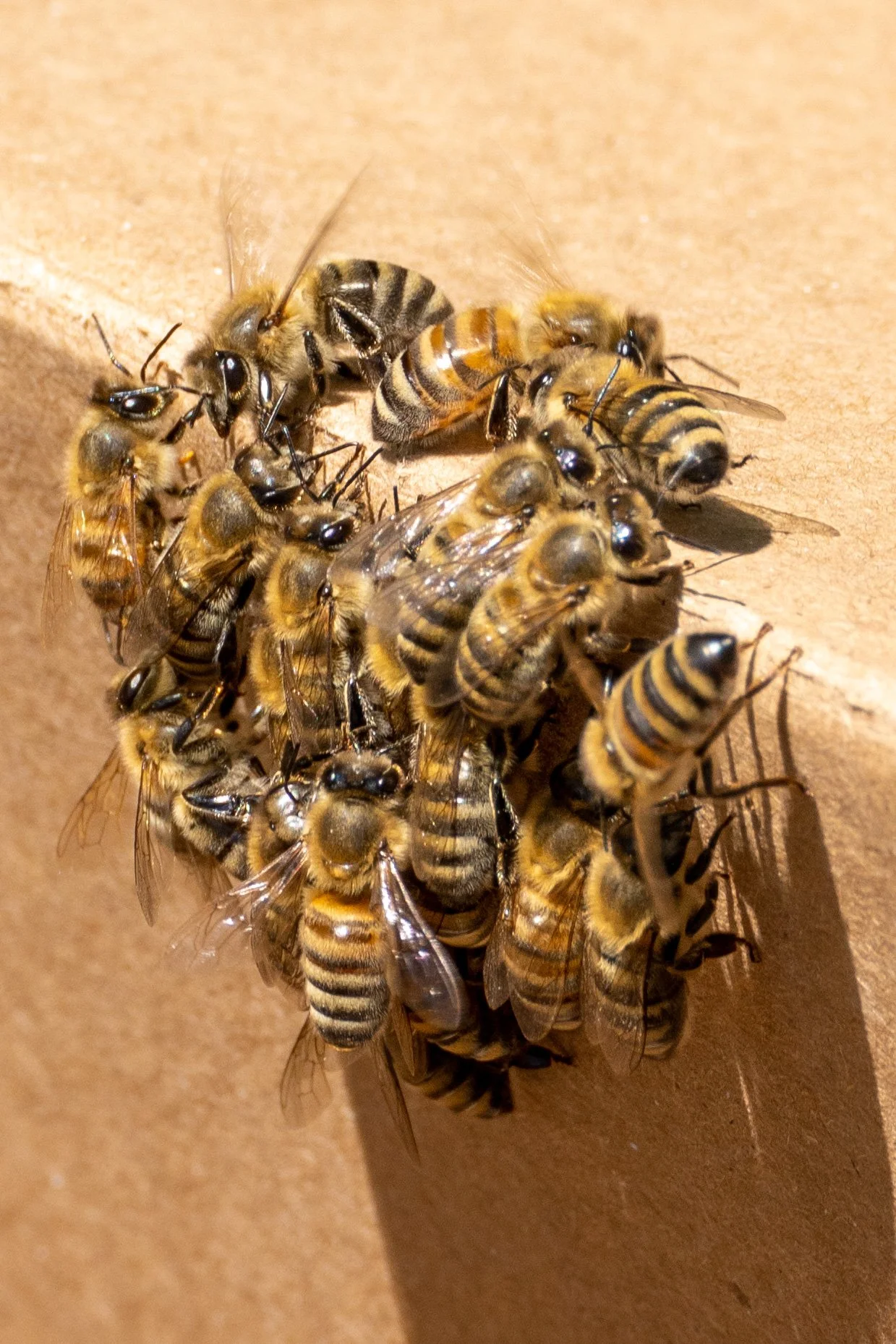 Bernie got to work quickly, lit his bee smoker and started collecting as many of the bees as possible into a cardboard box. He then gently shook the box and swept the bees into a wooden beehive box he had brought with him and carefully slid the lid mostly closed. He was hoping to get the queen into the box so the rest of the bees would stay.