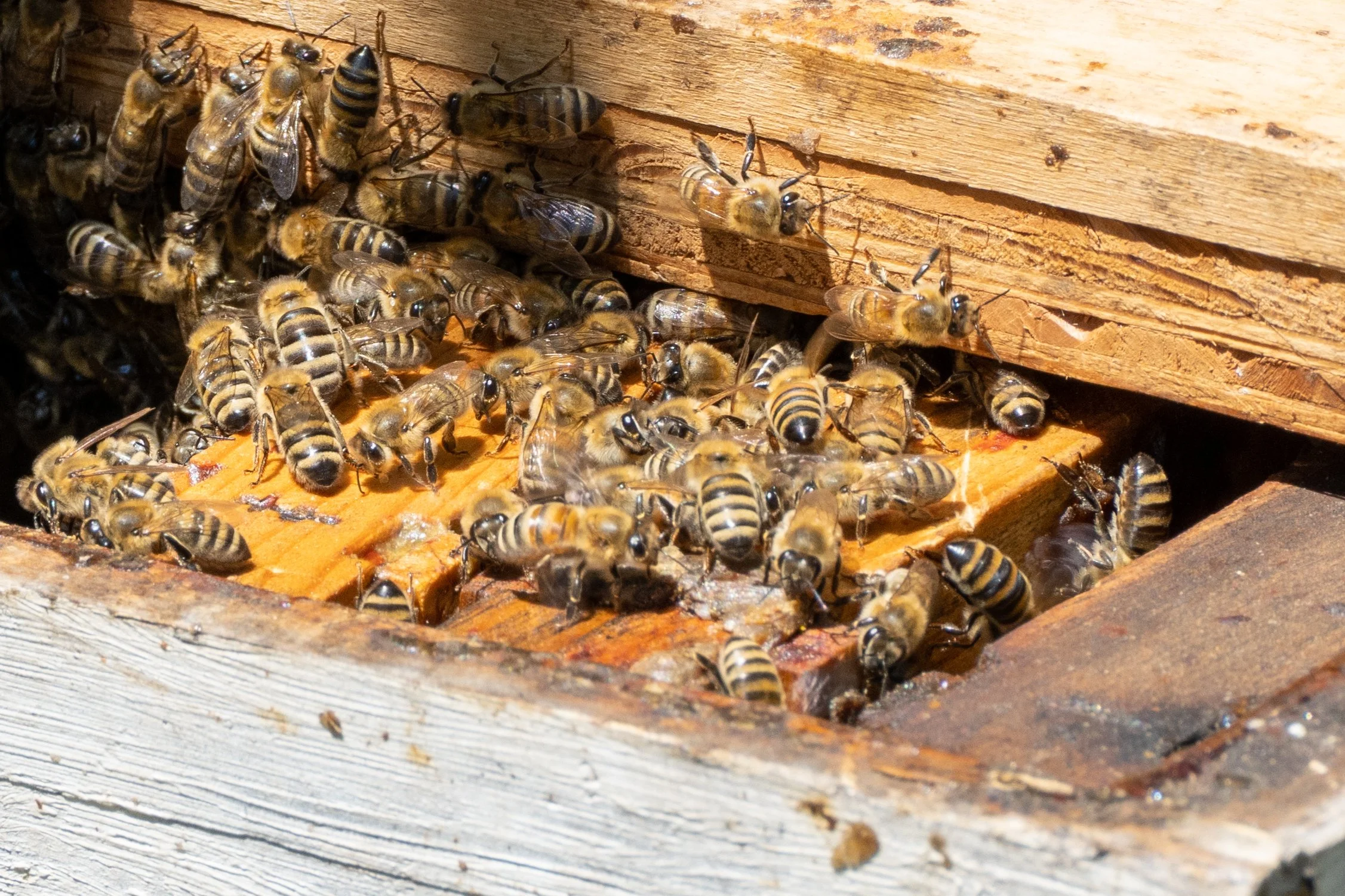 One of the bees picked up the leaf and flew away with it. No leaves allowed!